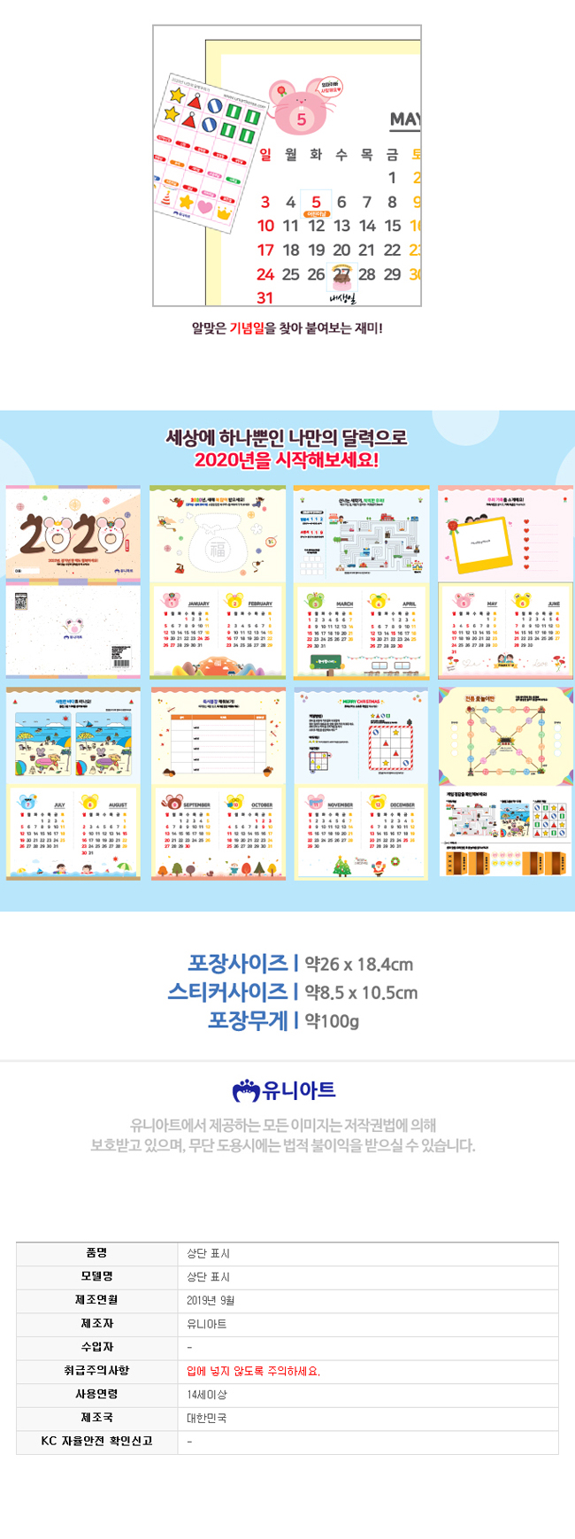 유니아트 2020년 나만의 달력 꾸미기 벽걸이용 요약정보 및 구매