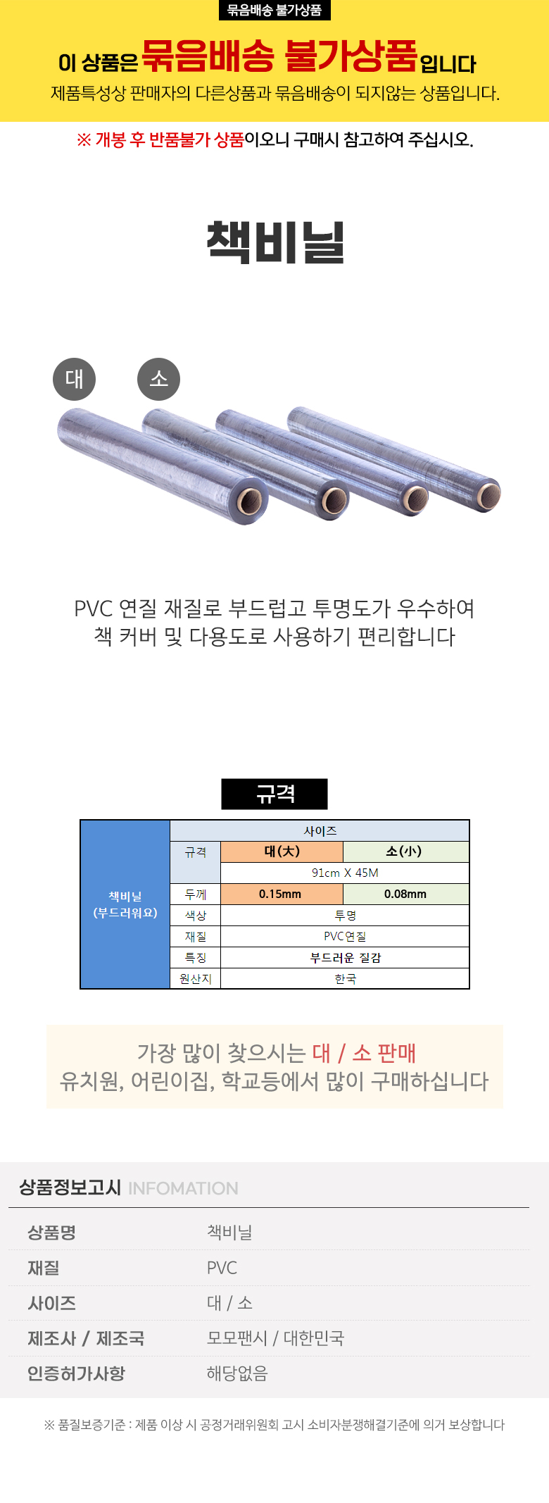 책비닐 대 PVC 비닐 필름 두께 0.15mm 91cm x 45m > 책비닐